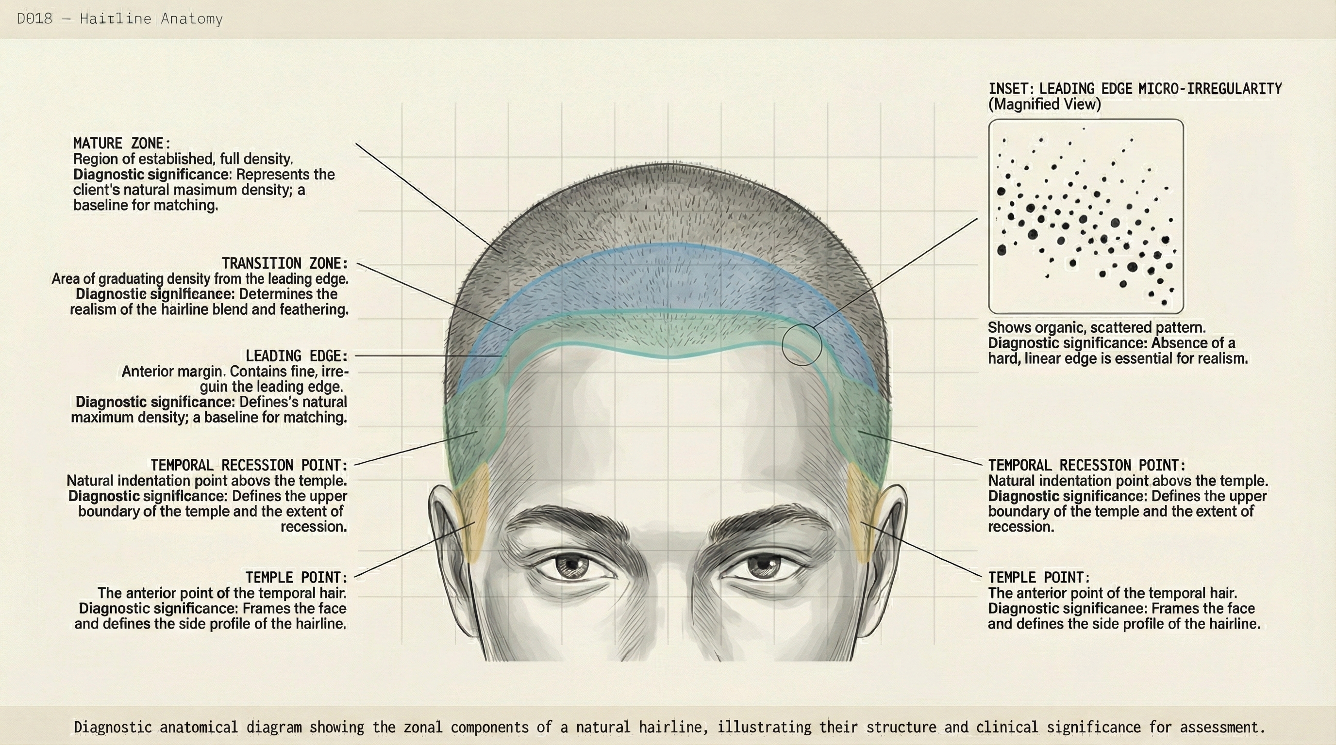 A natural hairline is not a single line. It is a transition zone with five distinct components that work together to create the perception of organic hair growth.